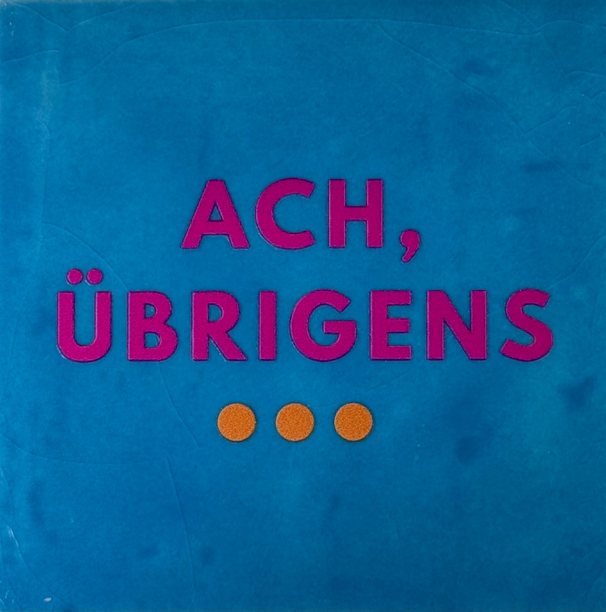 Quote tegeltje 'ach übrigens' lichtblauw/knalroze(oranje)
