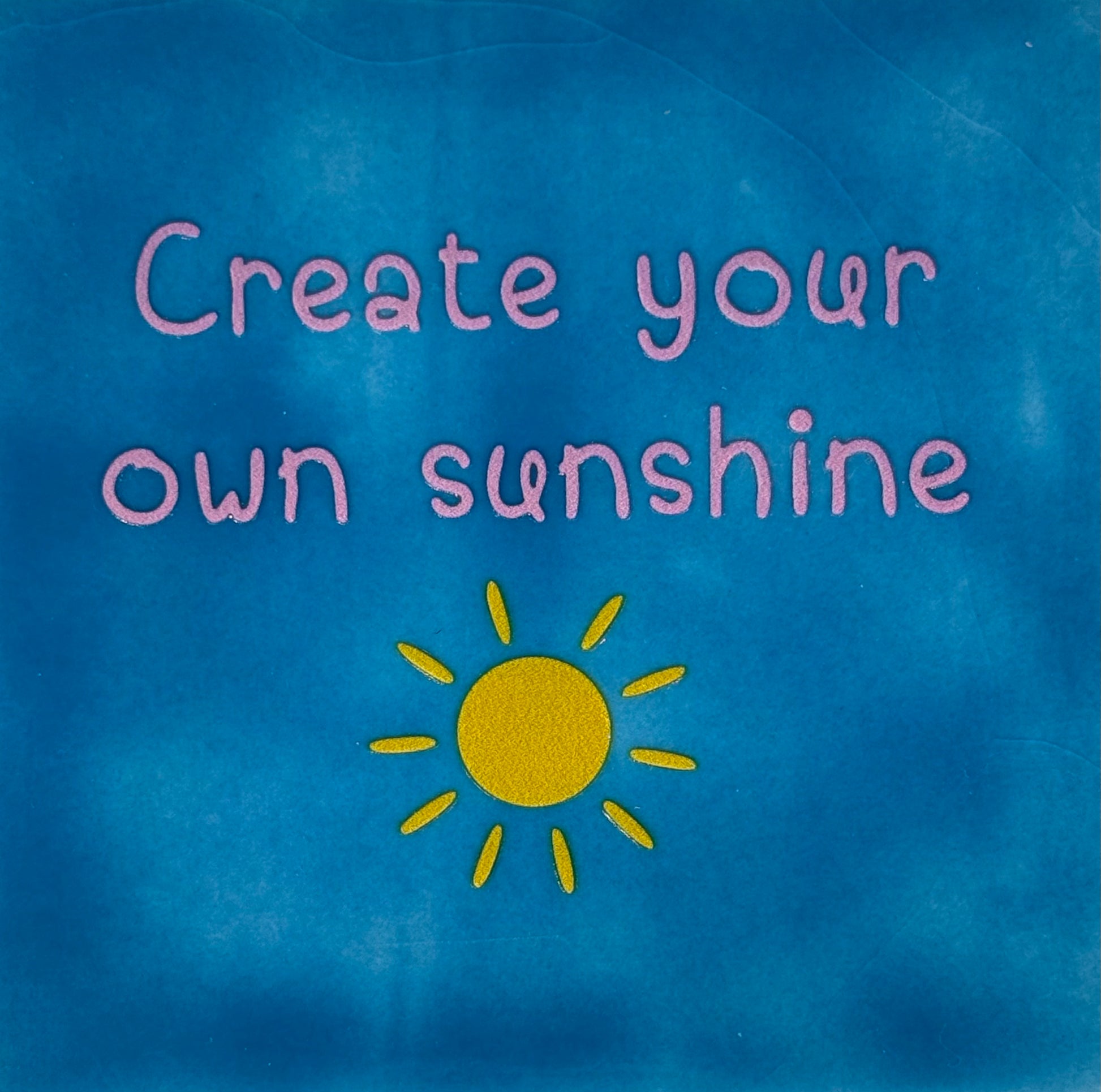 Quote tegeltje 'create your own sunshine' lichtblauw/warmroze (geel)