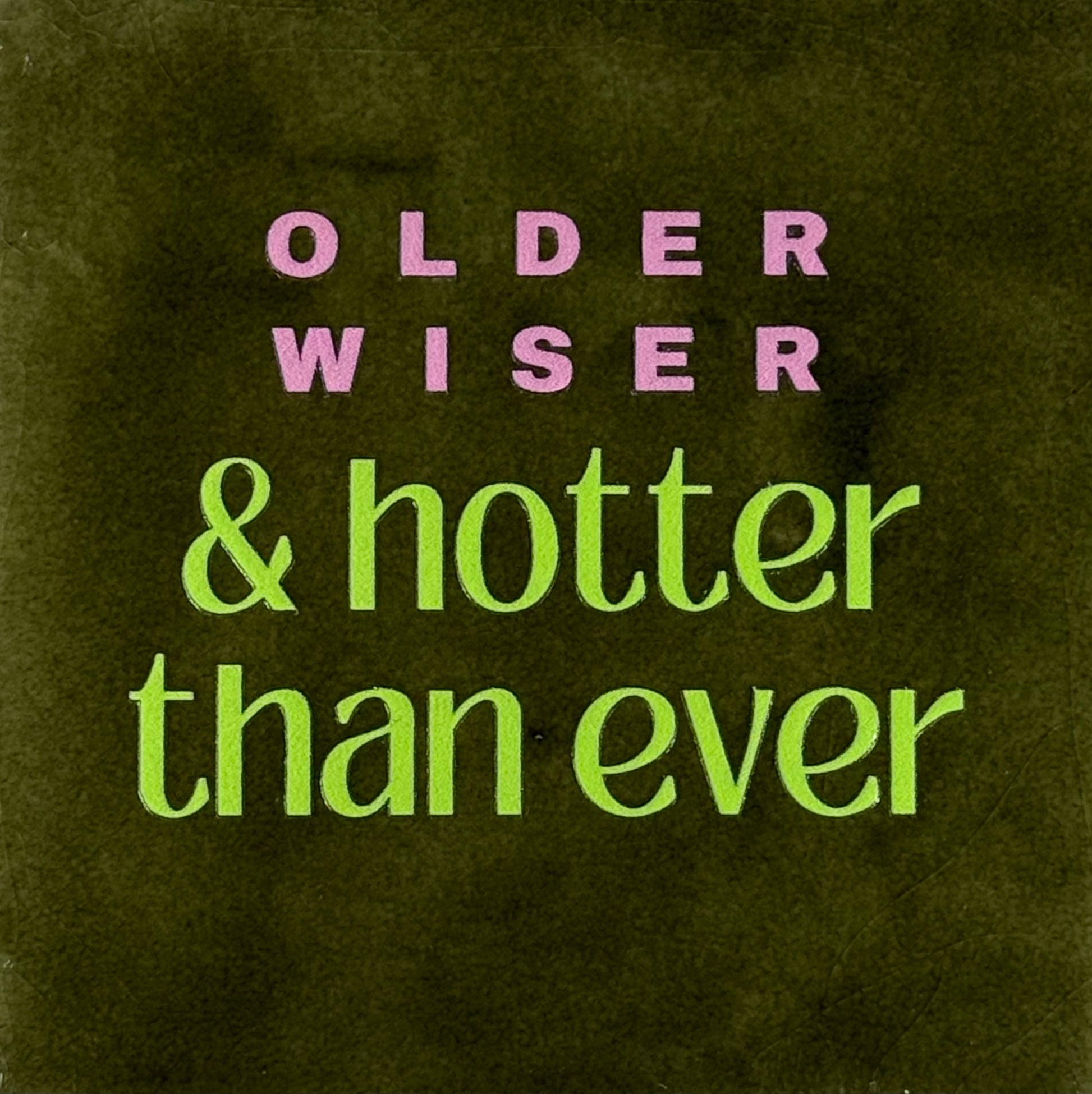 Quote tegeltje 'older wiser & hotter than ever' olijf/lime(warmroze)