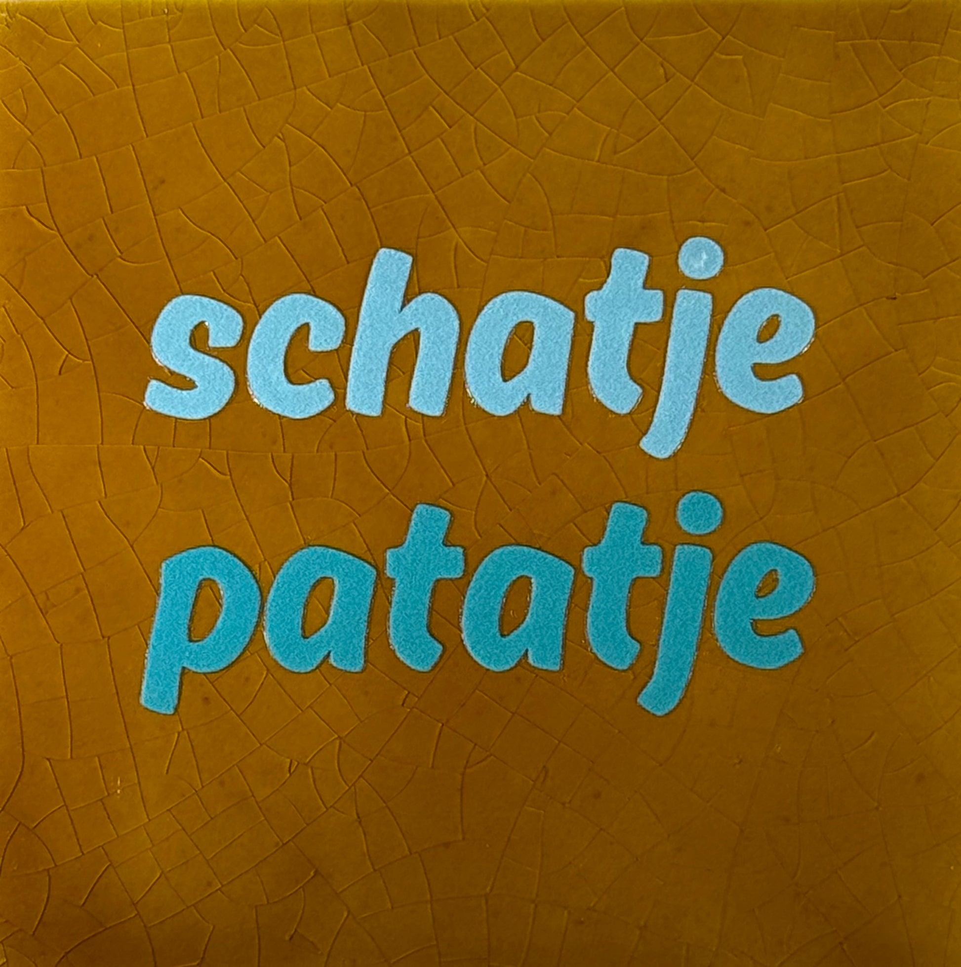 Quote tegeltje 'schatje patatje' oker/warmblauw(turquoise)