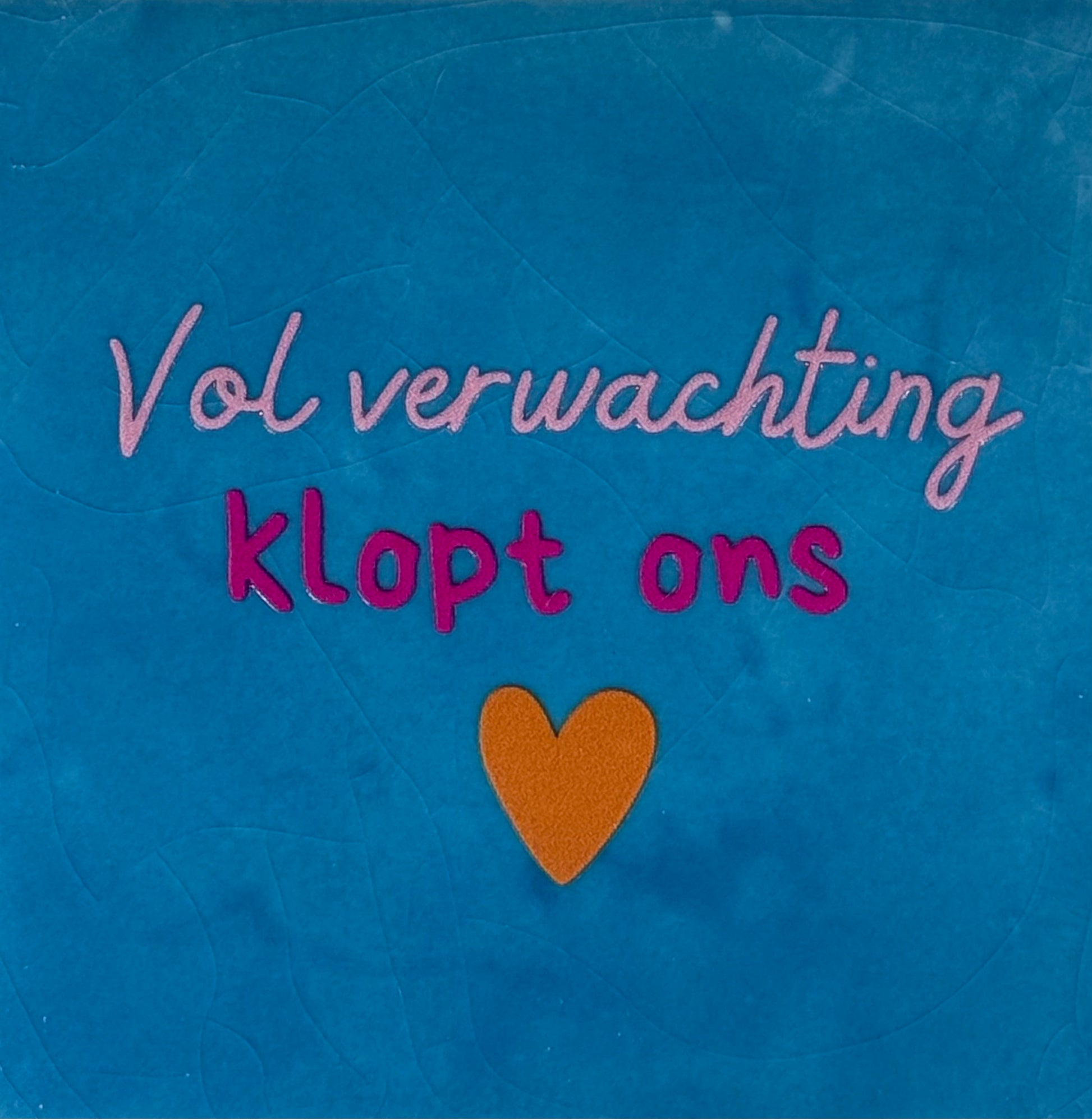 Quote tegeltje 'vol verwachting klopt ons hart' lichtblauw/warmroze(knalroze-oranje)